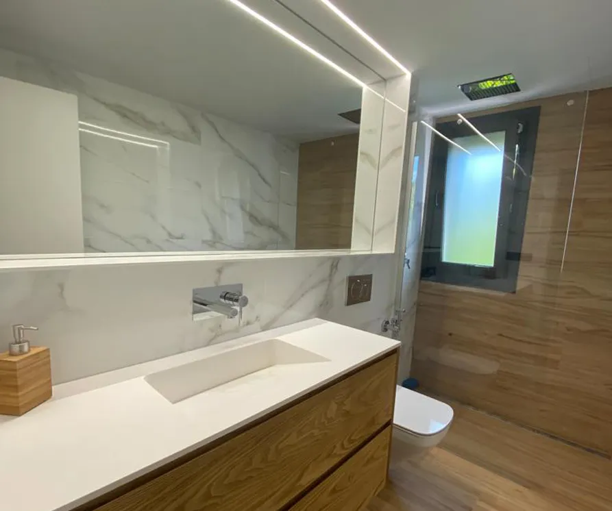 Incorporamos materiales resistentes a la humedad, platos de ducha, mobiliario funcional y diseños pensados para el confort diario.